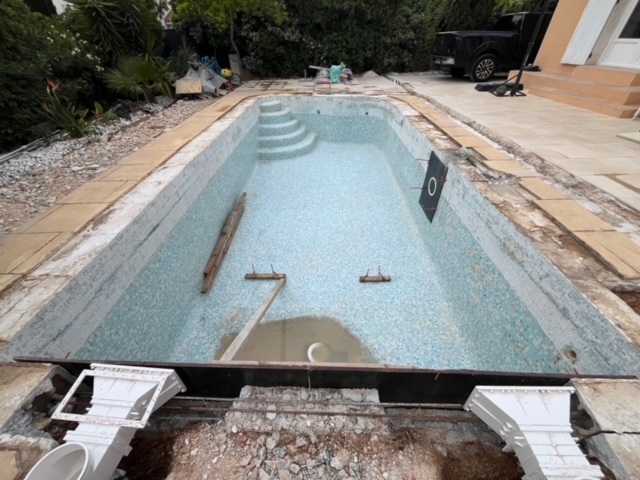 Pour ce chantier notre équipe est intervenue sur une piscine rectangulaire de 7,50 m par 3,50m avec une profondeur en pente douce de 1,30m à 1,70m.