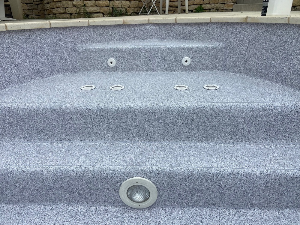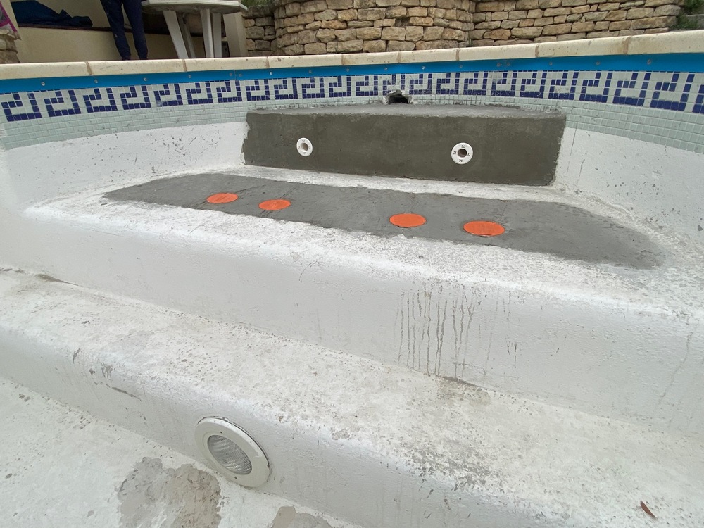 La création d'une marche supplémentaire intégrant deux jets de refoulement pour une meilleure circulation de l'eau ainsi que quatre jets d'air en remplacement du bulleur d'origine.