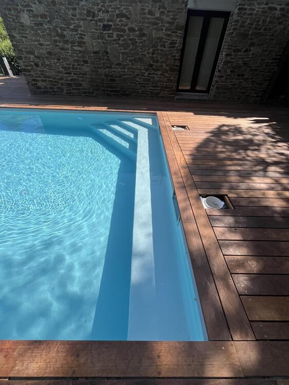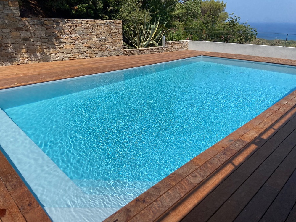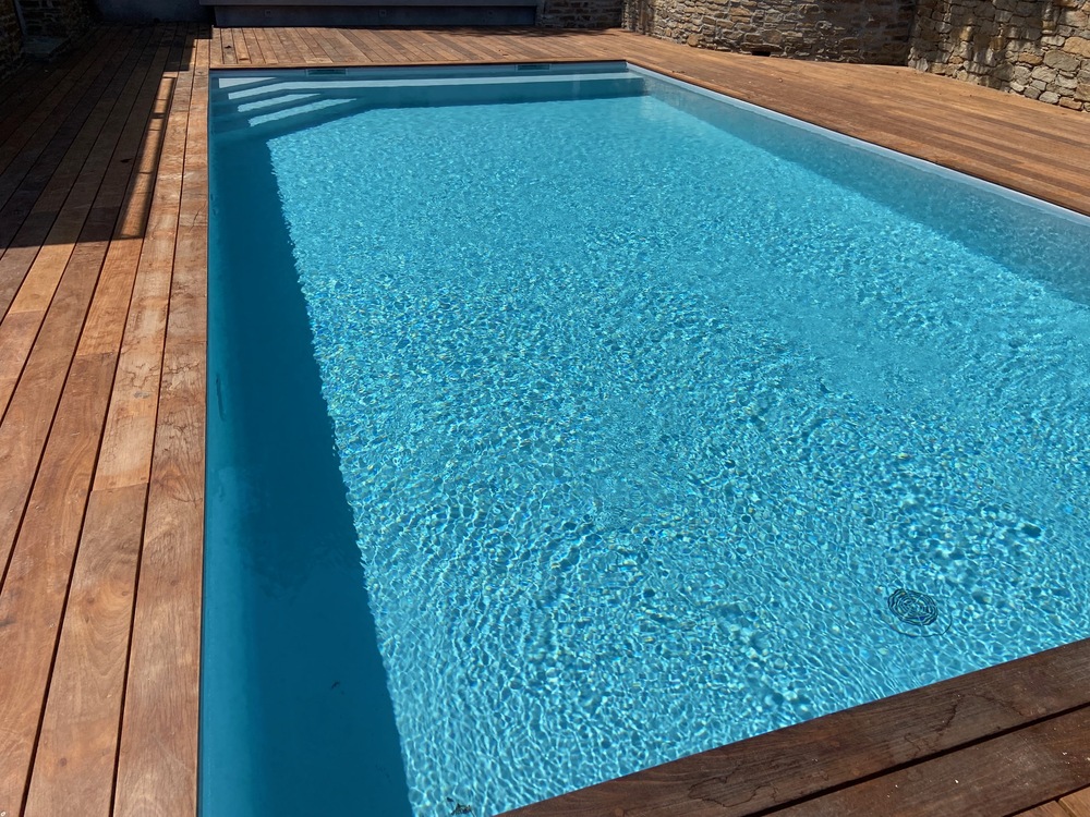 Les clients ont choisi la membrane armée 150/100ème Alkorplan 2000 gris clair qui lors du remplissage apporte une eau lumineuse et rafraîchissante.