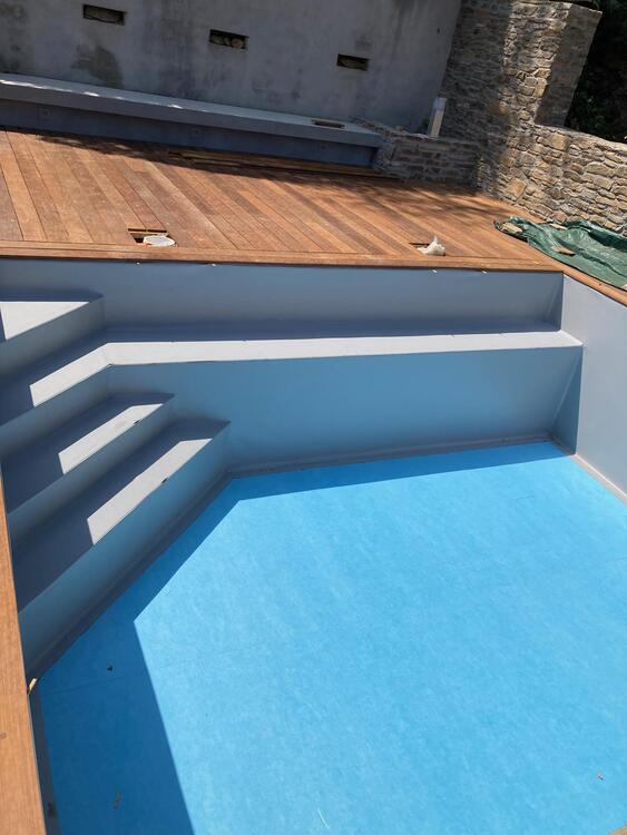 Avant la pose du revêtement de la piscine, le sol et les parois du bassin sont soigneusement recouverts d'une feutrine antibactèrienne, garantissant une protection optimale et un confort durable.