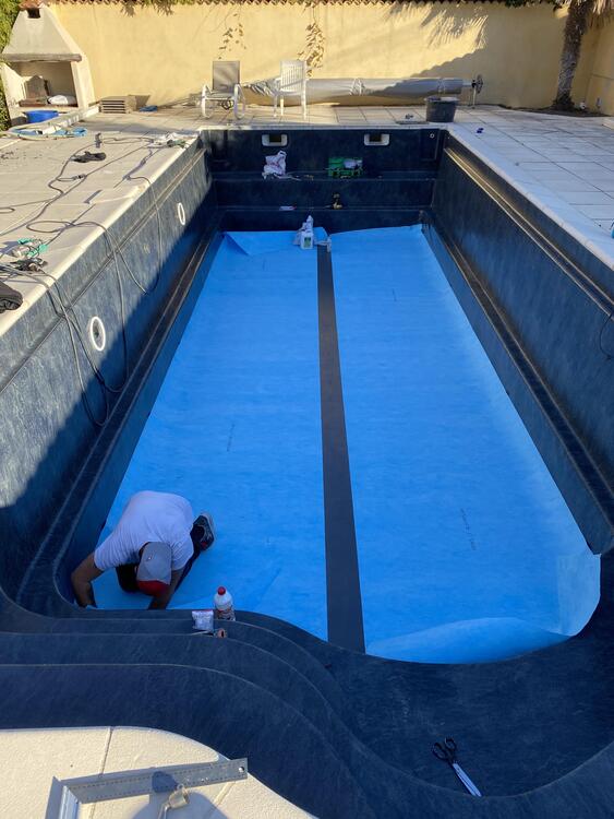 Pose d'une membrane armée " Alkorplan " gamme Touch modèle Sublime pour cette piscine.