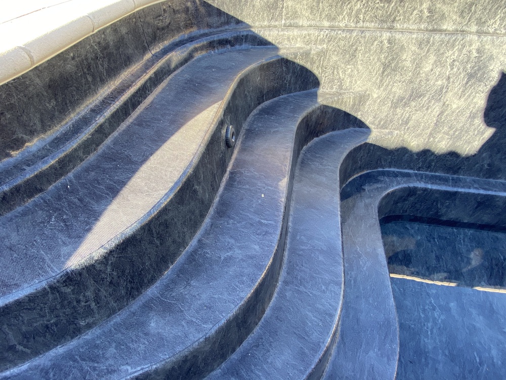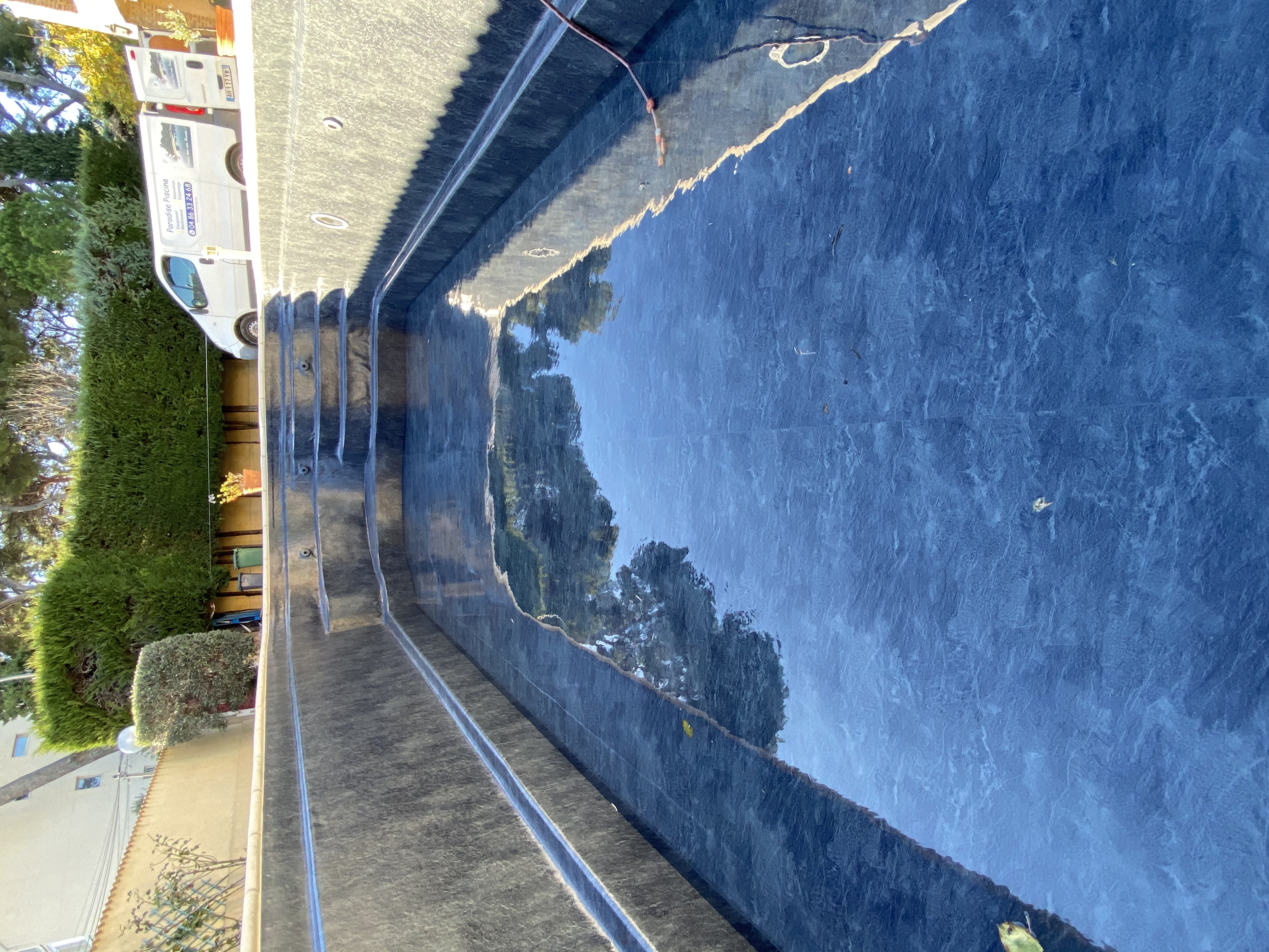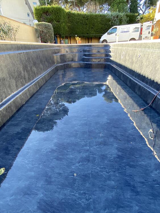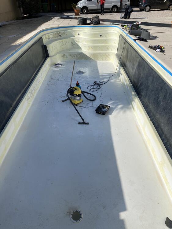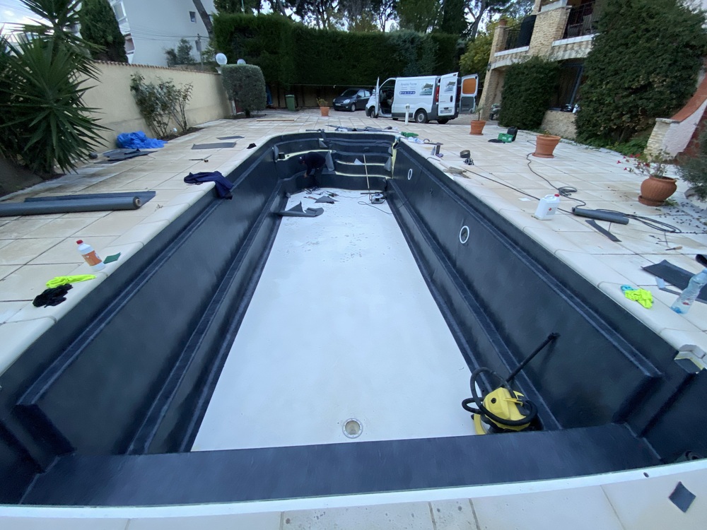 Rénovation d'une piscine carrelée, par la pose d'une membrane armée Alkorplan 2000 couleur blanc.
